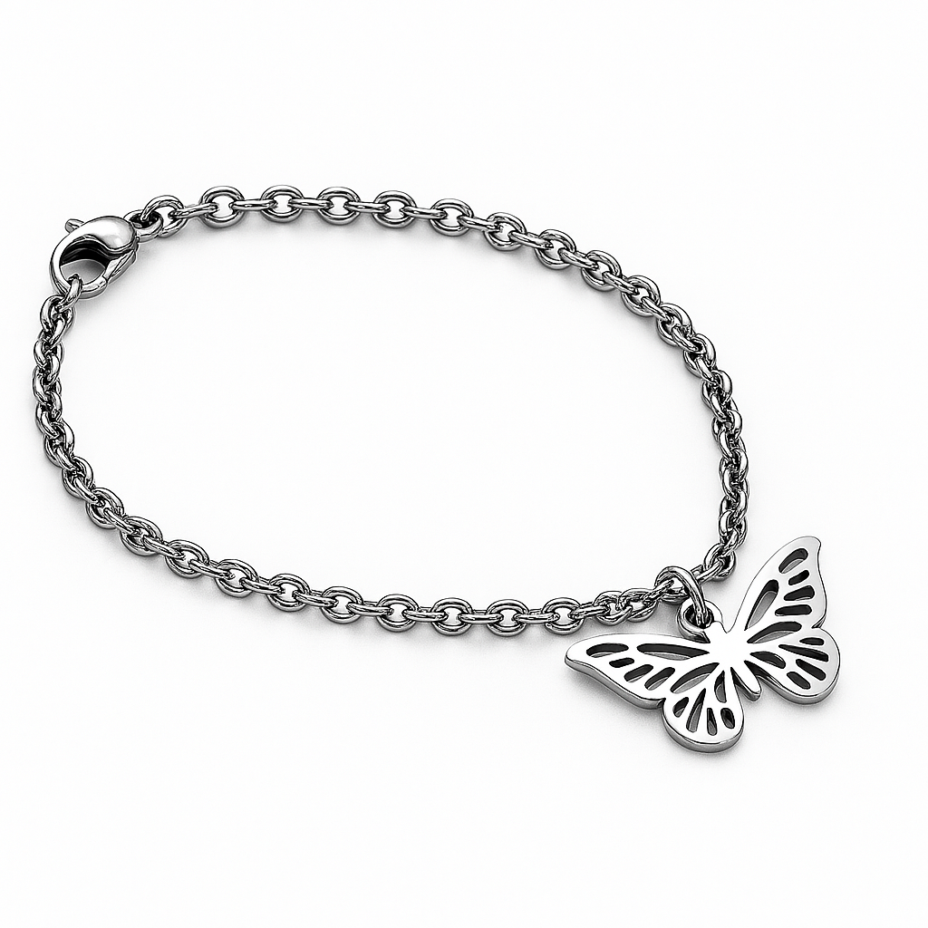 Add a delicate touch of elegance with this stainless-steel butterfly bracelet. Featuring a polished chain and butterfly charm, this piece blends timeless design with everyday durability. Tarnish‑resistant, it’s made for effortless, long‑lasting wear—perfect on its own or layered with other favorites.